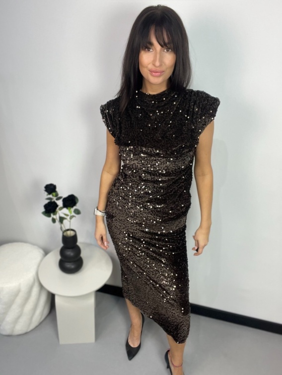 Delikatne obszycie z błyszczących cekinów dodaje całości subtelnego blasku, dzięki czemu spódnica świetnie sprawdzi się zarówno na wieczorne wyjścia, jak i eleganckie okazje. Materiał jest przyjemny w dotyku, elastyczny i komfortowy podczas noszenia.