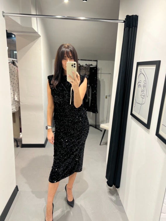 Delikatne obszycie z błyszczących cekinów dodaje całości subtelnego blasku, dzięki czemu spódnica świetnie sprawdzi się zarówno na wieczorne wyjścia, jak i eleganckie okazje. Materiał jest przyjemny w dotyku, elastyczny i komfortowy podczas noszenia.